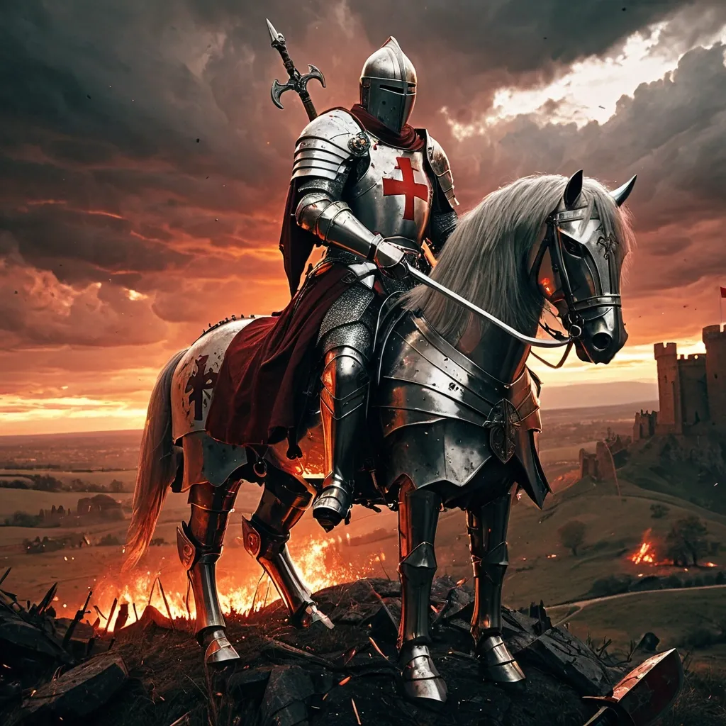 A valiant knight riding amidst a battlefield withothertemplar , wearing a gleaming suit of armor adorned with a prominent red cross on a white background that signifies his allegiance. The knight's steely demeanor is enhanced by the dramatic , fiery sunset behind him , casting an ominous glow over the scorched terrain littered with debris from a recent conflict. The setting evokes a blend of medieval and fantasy elements , reminiscent of classic epic tales. The atmosphere is thick with tension , accentuated by dark clouds swirling above , hinting at a storm. Incorporate (dramatic lighting:1.3) from the sunset to highlight the knight's features while maintaining depth in the background. The composition should showcase the knight slightly off-center , with ruined castle remnants and scattered weaponry framing him , emphasizing his solitary courage. Utilize a hyper-realistic style inspired by classic oil painting techniques , with sharp details on the armor (high detail:1.2) and fluid blend of colors in the sky. Consider negative prompts to avoid excessive brightness and cartoonish elements , keeping the overall tone serious and intense. ,