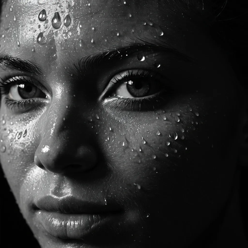 generar un retrato de primer plano de mi rostro con alto contraste , enfocado en la frente , en blanco y negro , con un lent de 97 35 mm , calidad 4HD con una expresión de orgullo , gotas de agua en mi cara , fondo de sombra negra , que solo sea visible la cara y con mi perfil viéndose más nitido , 4 en proporción 4:3 ,