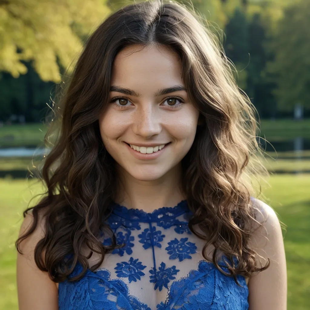 Ultra-high-definition photorealistic close-up portrait of a 28-year-old brunette woman with long , wavy hair , wearing a blue lace dress and smiling confidently at the camera. Her skin is radiant and natural with a warm , approachable expression. Her make-up is subtle but not overdone. The background depicts a soft , blurred park with trees and a lake. The lighting is bright and even , emphasizing her features and the friendly tone of the image. ,