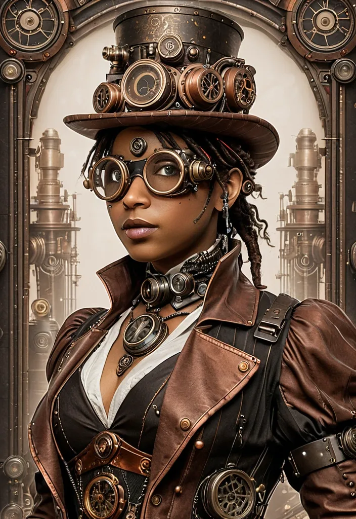 Photo realistic full lenght white steampunk open lace shirt , brown corset with clockworks parts , green openside wrap skirt , brown leggings , green boots , long brown wavy hair a bronze hair clip white pale freckled 30yo european woman with little blue hair clip with glasses , she standing up a hand on her hip and steampunk book in the other , she is in a steampunk laboratory full of book and machinery she have a little smile ,