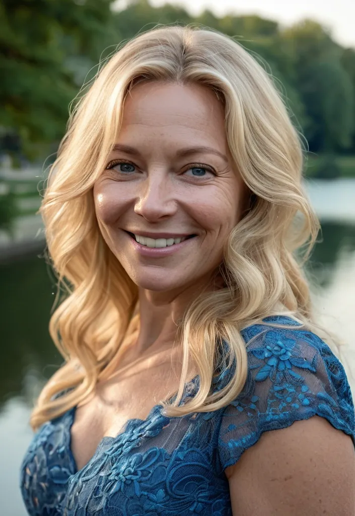 Ultra-high-definition photorealistic close-up portrait of a 42-year-old blonde woman with long , wavy hair , wearing a blue lace dress and smiling confidently at the camera. Her skin is radiant and natural with a warm , approachable expression. The background depicts a soft , blurred park with trees and a lake. The lighting is bright and even , emphasizing her features and the friendly tone of the image. ,
