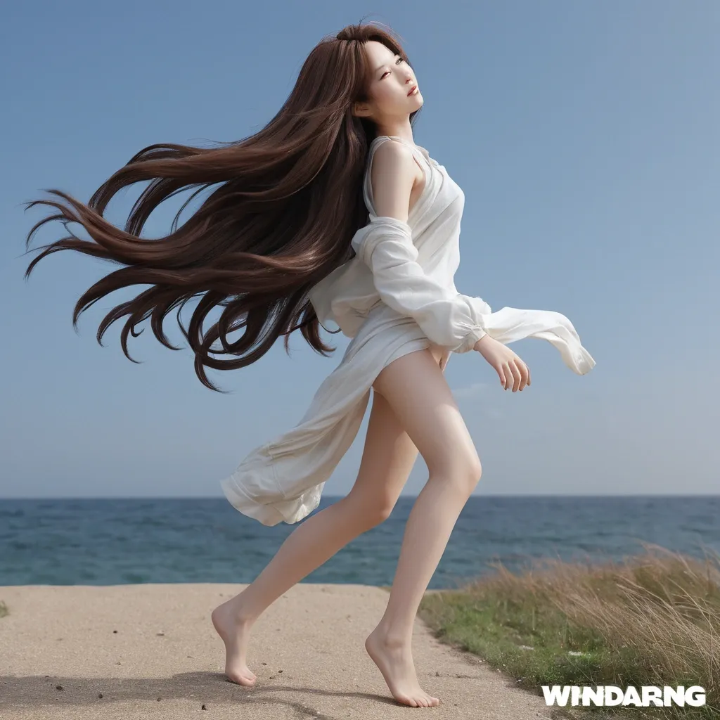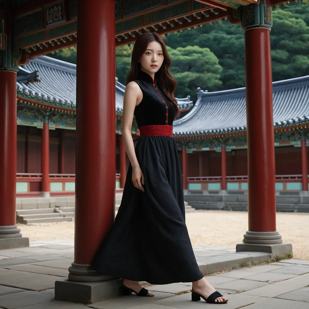 Full length of a Korean female. Model named Mina. Please transform the original image into a hyperrealistic live-action film style to create an attractive full-body image of a 20-year-old Korean woman. She has rich , long brown hair , and the appearance of her hair blowing gently in the wind. He wears a black sleeveless midi dress , with red lace details on the top and a natural red velvet scarf on the chest. With a clean 36-24-39 body , long legs in black sandal heels stand out , and the head and head sizes are harmoniously adjusted to match the overall proportion. Her face , staring at the camera with a soft smile , is maximized with a clean , vivid skin texture and delicate features. Behind the scenes , the bright and antique backdrop of Changdeokgung Palace is spread out in a hyper-realistic manner , and the pillars of Baeheulim have colored decorations like dancheong , and there are pavilions harmonized with elegant lattice-patterned windows visible in the distance. It is vivid and detailed like a still cut from a movie , and with hyperrealism that maximizes the texture of the character's skin , hair by hair , and the material of the clothes , create a mysterious and elegant atmosphere with soft lighting and deep colors. ,