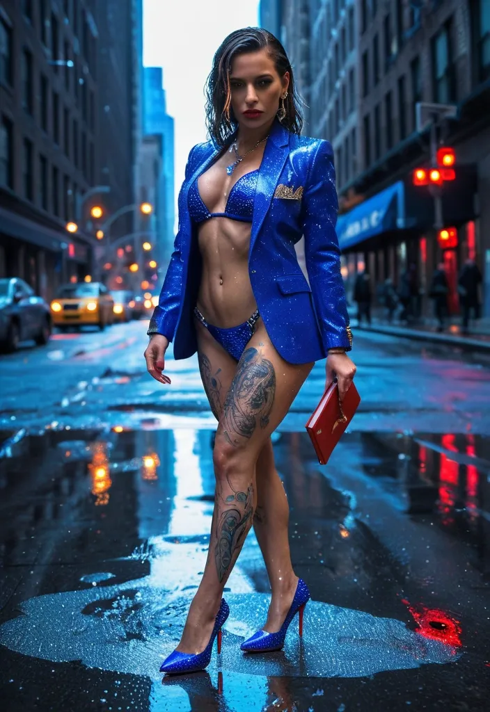 A woman in a Swarovski crystal-embellished royal blue bikini stands assertively on a rain-slicked New York City street , her body adorned with elaborate tattoos. She wears sharp Christian Louboutin stilettos and a structured blazer , clutching a leather case file as neon shop signs cast colorful reflections on the wet asphalt. ,
