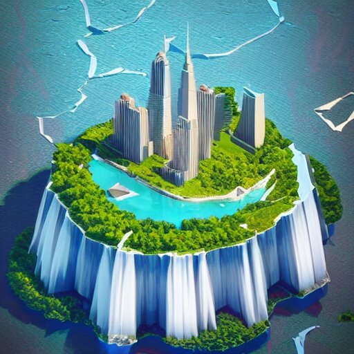 low poly art of a round floating island in the sky with the skyscrapers of New York on it , surrounded by waterfalls , isometric art , 3d render , ray tracing , high detail , artstation , concept art , behance , smooth , sharp focus , ethereal lighting , unreal engine 5 ,