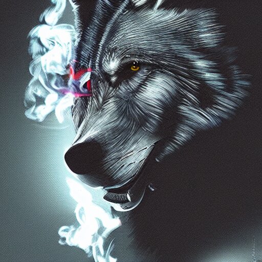 a robotic wolf smoking a cigarette vibrant lighting , elegant , highly detailed , smooth , sharp focus , illustration , beautiful , geometric , trending on artstation , full body , cinematic , artwork by borovikovsky ,