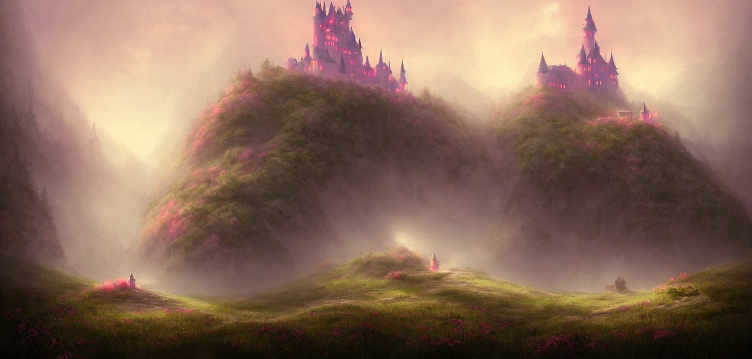 a fairytale castle on a hill in the forest pink fog envelops the castle landscape , cinematic view , epic sky , detailed , concept art , low angle , high detail , warm lighting , volumetric , godrays , vivid , beautiful , trending on artstation , by jordan grimmer , huge scene , grass , art greg rutkowski ,