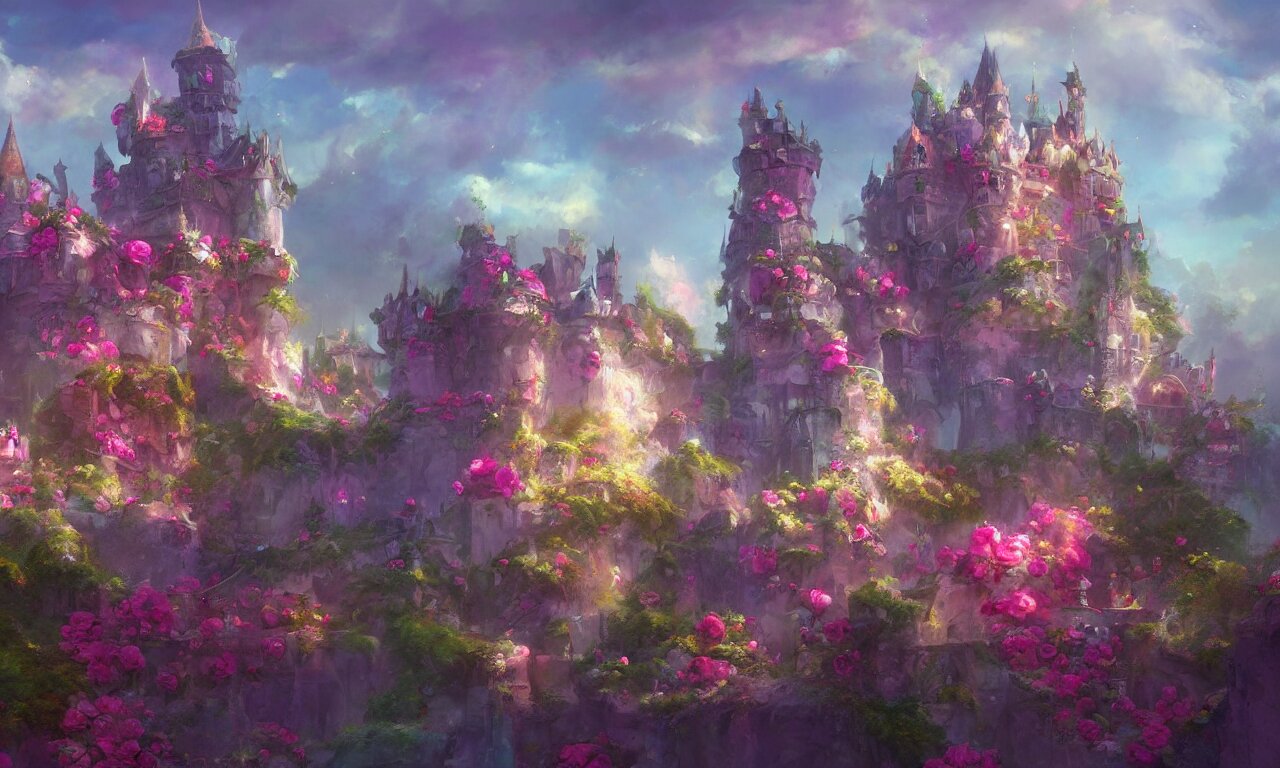 concept art of the colorful rose castle , spectacular , magnificent , fantasy , artstation , render by blender , by krenz cushart ,