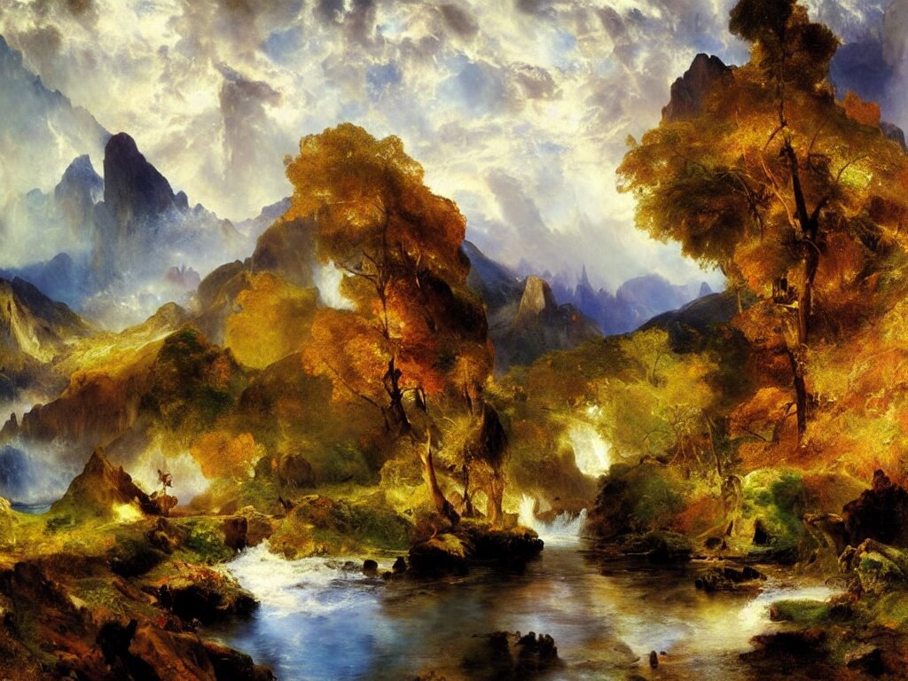 a beautiful landscape painting by thomas moran , trending on arstation ,