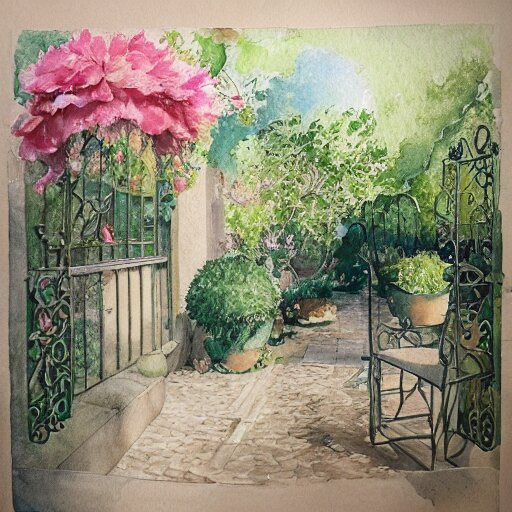 delicate , garden , paved , botanic watercolors , iridescent , 8 k , realistic shaded , fine details , artstation , italian , chairs , iron gate , pine maritime , mediterranean ,
