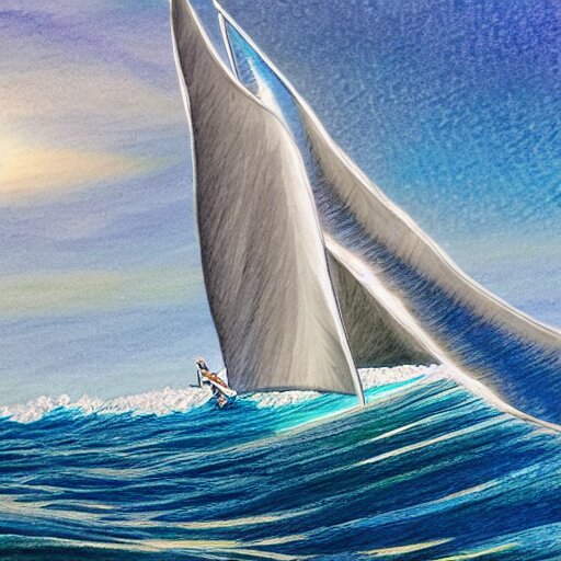 Colored pencil art on paper , Sailboat surfing the waves , highly detailed , artstation , MasterPiece , Award-Winning , Caran d'Ache Luminance ,