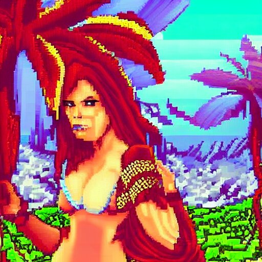 pixel art , 32-bit pixel art , vibrant sprite art , barbarian girl , electrified hair , prehistoric fantasy , palm trees ,