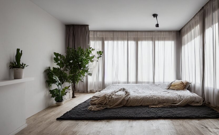saudi arabian apartment bedroom interior , minimalism , bed , cupboards , modernism , persian design , compact , beige , black , wood , rust , little windows , brass , plants , retro futurism , swedish design ,