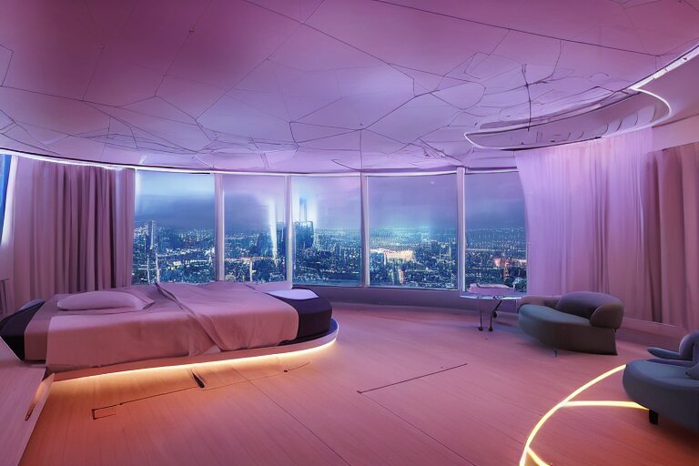 a futuristic sparse bedroom with large curved ceiling high windows looking out to a far future cyberpunk cityscape , flying drones outside , night time , cyberpunk neon lights , raining ,
