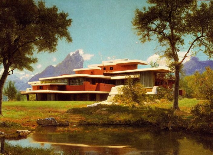 painting of a frank lloyd wright house in front of beautiful mountains by albert bierstadt ,
