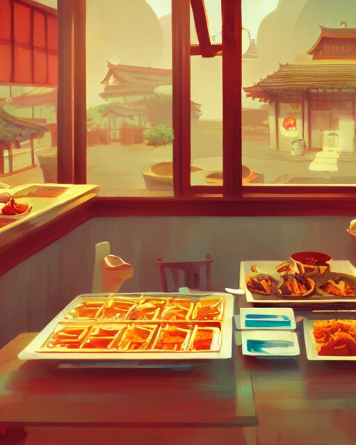 chinese buffet in a homely little restaurant , cory loftis , james gilleard , atey ghailan , makoto shinkai , goro fujita , studio ghibli , rim light , exquisite lighting , clear focus , very coherent , plain background , soft painting ,