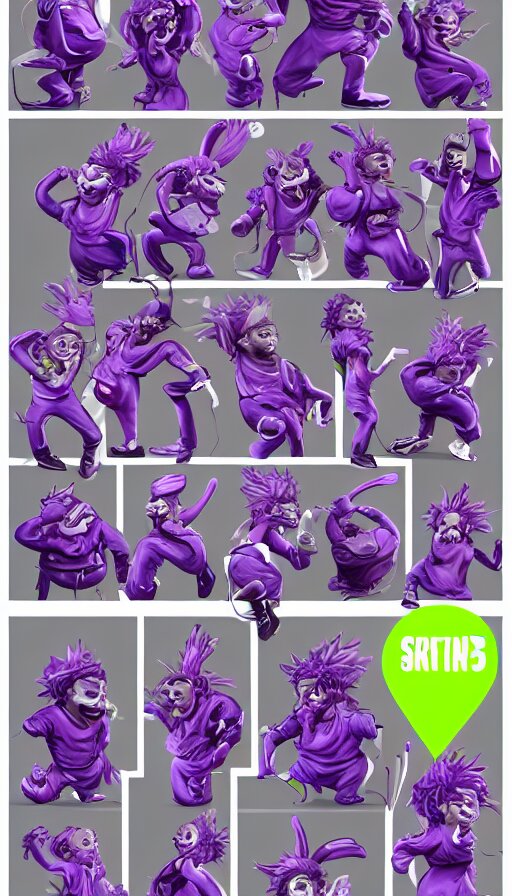 a sprite sheet of a graffiti wirter holding a spray can and purple hair , 3D character , sweat drops , insane , intricate , highly detailed , oil painting , smooth , sharp focus , Unreal Engine 5 , 8K ,