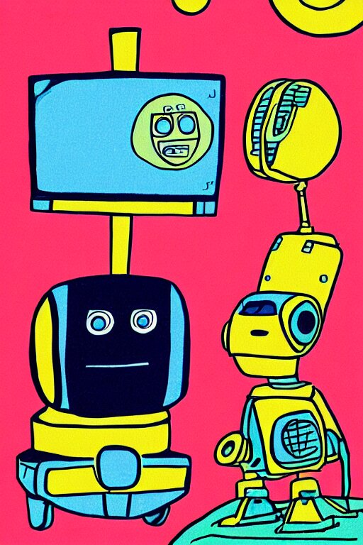 an illustration of robots watching tv in the style of goodnight moon by margaret wise brown ,