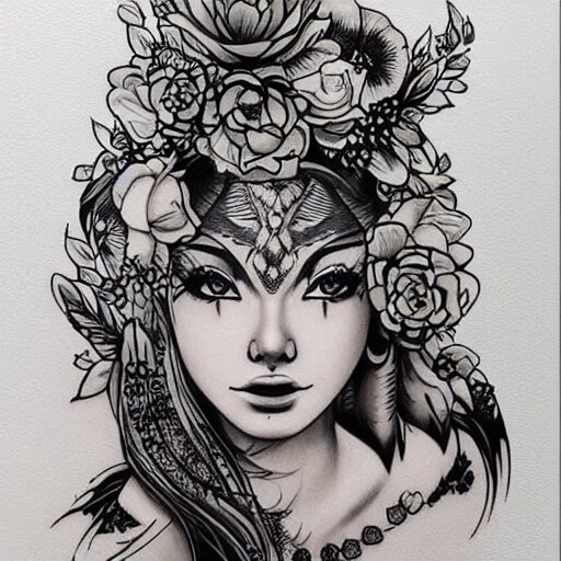 tattoo design , stencil , tattoo stencil , traditional , beautiful portrait of a warrior girl with a wolf headdress on surrounded by flowers , upper body , by artgerm , artgerm , artgerm , digital art , cat girl , anime eyes , anime , sexy-s 100 ,