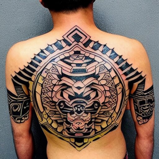 intricate japanese mayan yakuza tattoo , geometric dark animal tattoo , tattoo on upper arm ,