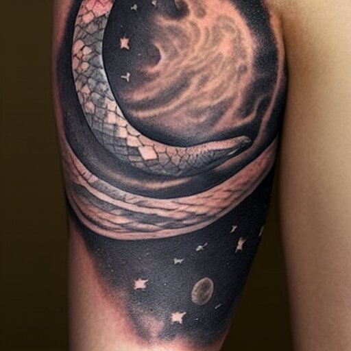 a woman with a tattoo of a snake sitting on the moon gazing at the milkyway , volumetric light , ray tracing , ,