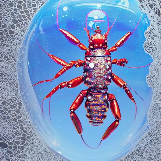 realistic extremely detailed photo style painting of a astronaut eva lobster suit covered in diamond 3d fractal lace iridescent bubble 3d skin + , camera appendage stalks+helmet clear brain case see through , in a jumping float pose inside of a futuristic space station blobby holograpic shrink wrap bubble , , opal ruby diamond iridescent fractal lace bubble materials , alternate reality ceramic age , monolithic retro futuristic , water , by style hybrid mix of beeple+Anton Pieck+Jean Delville+ Amano , Yves Tanguy+ Alphonse Mucha+ Ernst Haeckel+ Edward Robert Hughes+Stanisław Szukalski covered with compound eye camera lenses , neutron , rich moody colors , diamond dust glitter and sparkles , granular detail , holographic krypton ion , blue eyes , octane render , 4k , f32 , 55mm photography , wide angle , jumping float Pose , full shot , ,