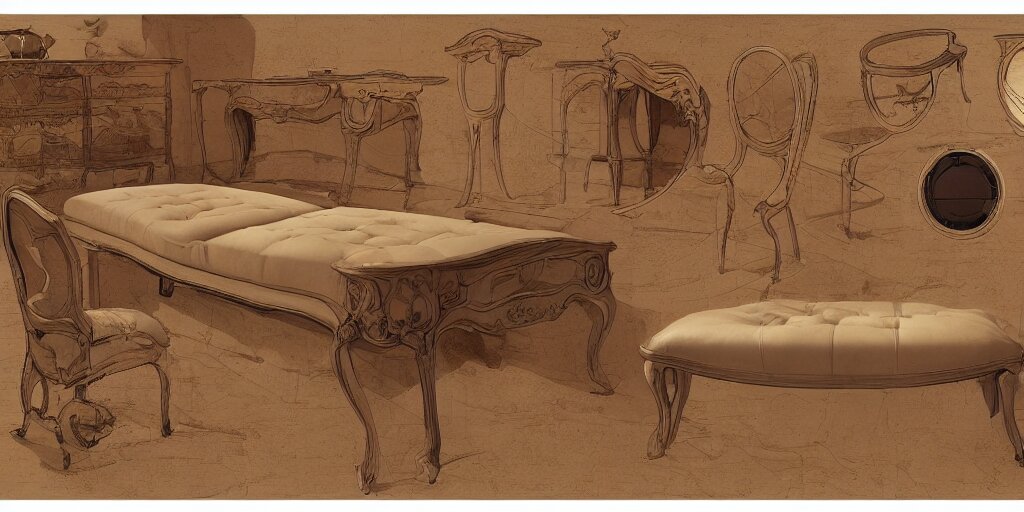 furniture design classic art , furniture design sheet , Moebius , Greg Rutkowski , Zabrocki , Karlkka , Jayison Devadas , Phuoc Quan , trending on Artstation , 8K , ultra wide angle , zenith view , pincushion lens effect ,