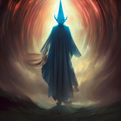 a slender wizard with horned mask levitating inside a wind twister colored like the rainbow , art by greg rutkowski , by ilya kuvshinov , digital art , artstation , detailed , realistic , long hair ,