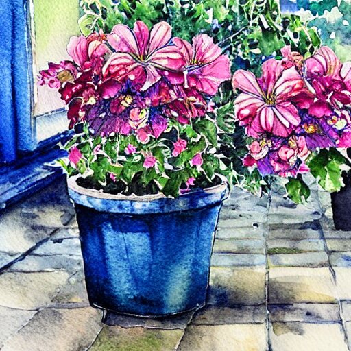 a beautifull intricate watercolor painting of potted planter with flowers inside sitting on wet sidewalk , reflexions , high details by stephanie law art ,