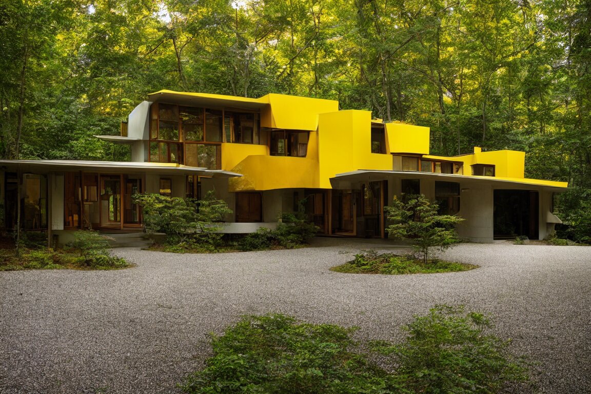 a mid century modern house in a forest , designed by Frank Gehry. Tiles. Small gravel driveway . Film grain , cinematic , yellow hue ,