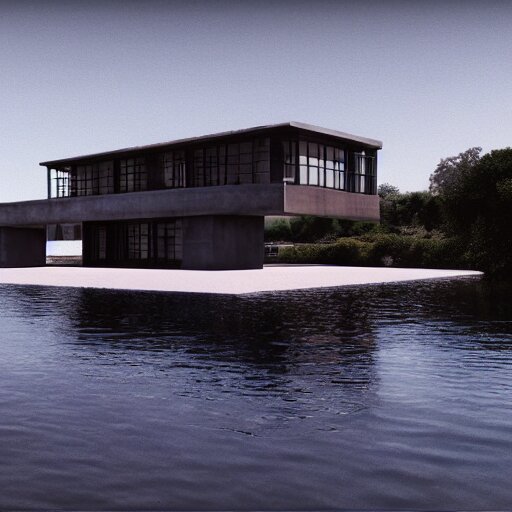 brutalist villa on edge of a lake , antoni gaudi and le corbusier , photorealistic , cinematic , volume light , rendered in octane , artstation ,