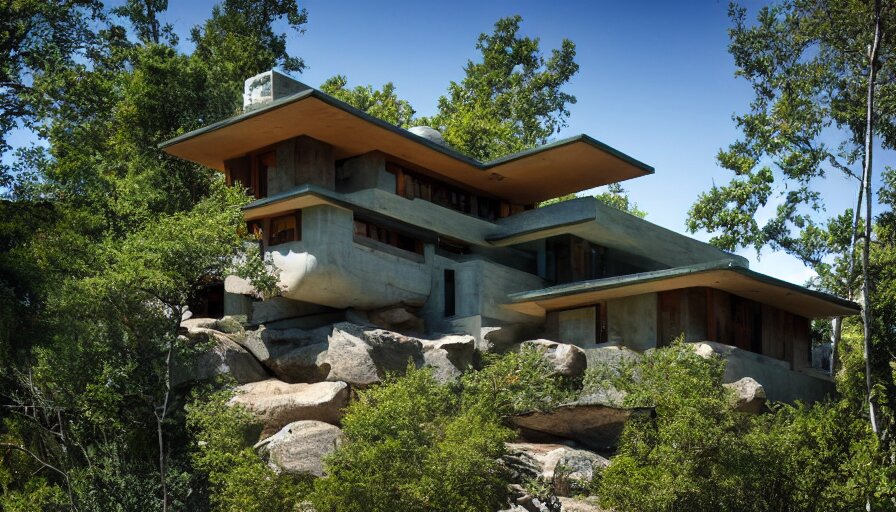small modern house , tibetan inspired architecture , on a green hill between trees and big boulders , frank lloyd wright , photorealistic , cyberpunk ,
