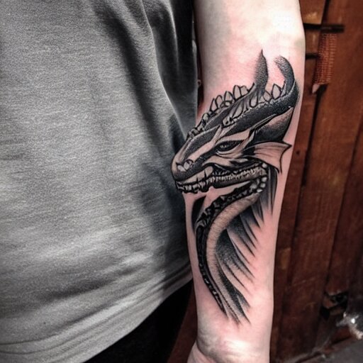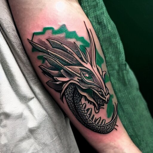 Tattoo of a dragon starting from the elbow , wrapping around the wrist in a downward spiral , emerald placed inside of the dragons mouth , forearm tattoo ,