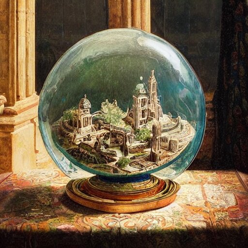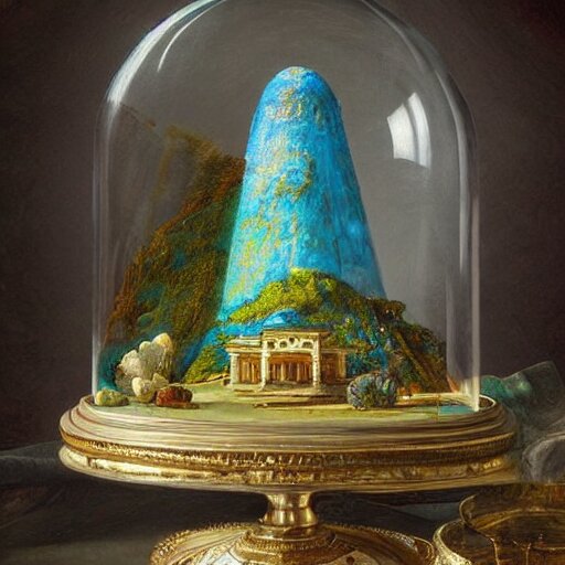 still life painting of a minature tabletop ancient city under a glass dome , by paulette tavormina and clara peeters and willem kalf , cool color - scheme with blues and greens , hyper realistic , super detailed , beautiful lighting ,