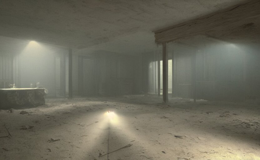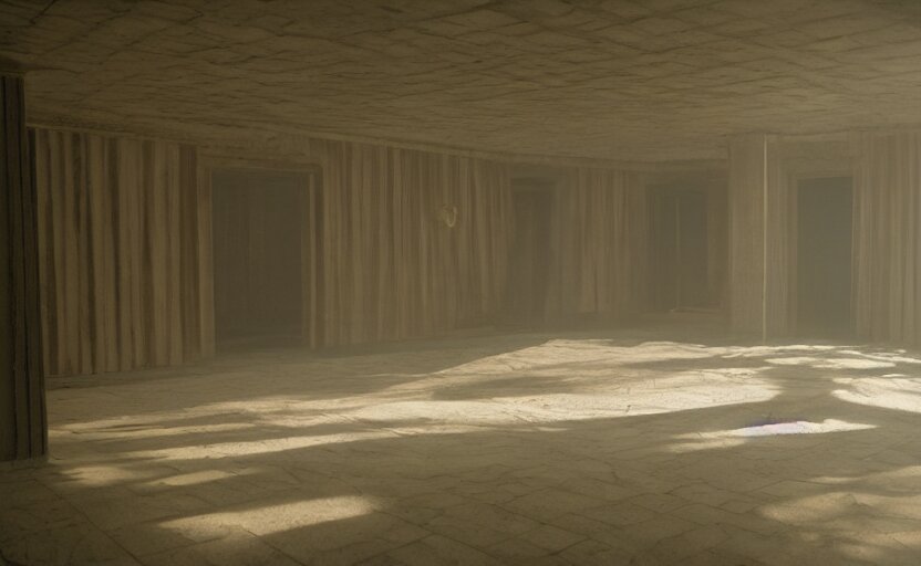 cinematic screenshot of the surreal interior for house built on nothing and something for the nothing underneath , moody scene from being john malcovich directed by charlie kaufman ( 2 0 0 1 ) , moody volumetric light morning , anamorphic lenses , kodak color film stock ,