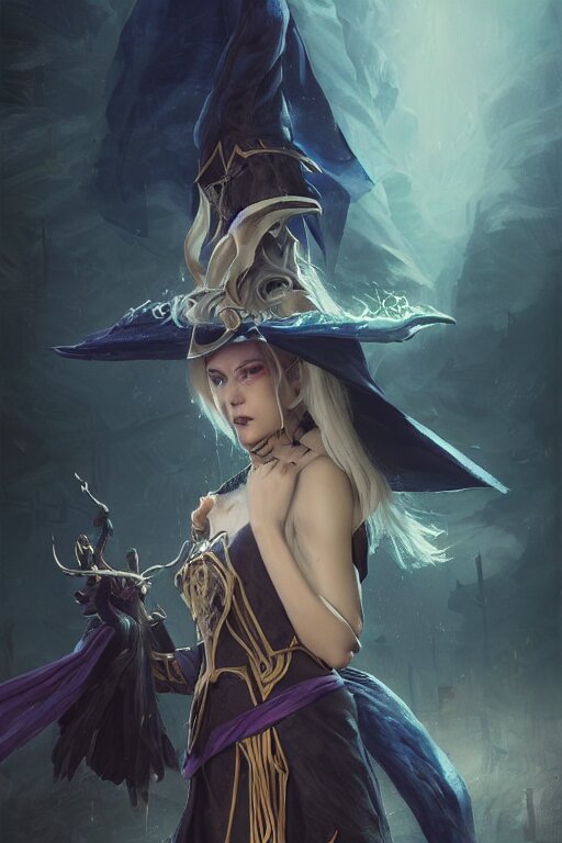 a beautiful dark magician girl with a large witches hat that covers her face by Greg Rutkowski , Sung Choi , Mitchell Mohrhauser , Maciej Kuciara , Johnson Ting , Maxim Verehin , Peter Konig , final fantasy , mythical , 8k photorealistic , cinematic lighting , HD , high details , atmospheric , ,