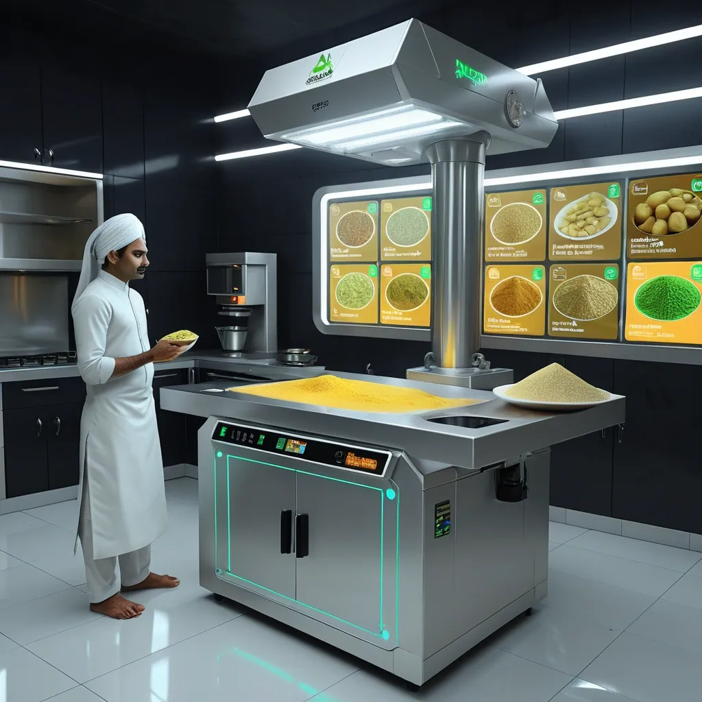 futuristic modern kitchen design , a samosa maker automatic digital machine , holographic display light , neon accents , clean sci-fi kitchen environment. The scanner emits holographic monitoring data that showcases real-time food ingredients (Key ingredients include flour , ghee/oil , carom seeds (ajwain) , potatoes , green peas , cumin seeds , ginger , green chilies , coriander powder , dry mango powder (amchur) , and garam masala) statistics and insights above the machine , automates samosa ingredients tracking and gives you actionable insights to cut costs , reduce CO₂ , and boost efficiency , without changing how female kitchen works. cinematic lighting , high detail , concept art , best quality , 16K ,