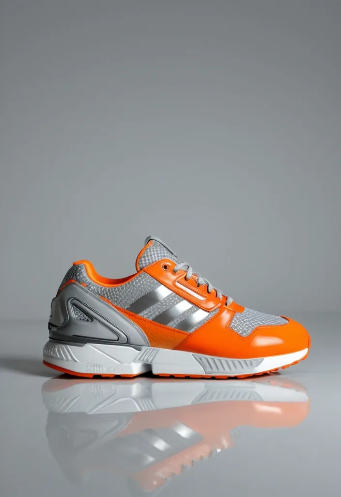 Ultra-photorealistic 8K studio photography of a single Adidas ZX 8000. Full side profile view. Shot on Canon EOS R5 , 100mm Macro lens for extreme material detail. THEME: BSR "Industrial Safety Net". COLORS: Light grey , safety-orange , white. NO black. MATERIALS: - Upper: Large-hole white mesh over an orange inner lining (Moiré effect). - Heel Cage: Light grey TPU with an industrial grid/waffle texture , NO logos , NO text. - Side Stripes: Matte silver-grey 3M material. - Midsole: Two-tone , white in the front , vibrant orange at the heel. - Torsion Bar: Polished light silver. LIGHTING: Sharp studio lighting to highlight the grid textures and material depth. Clean light-grey background. CONSTRAINTS: NO text , NO logos , NO asphalt , NO dark grey. ,