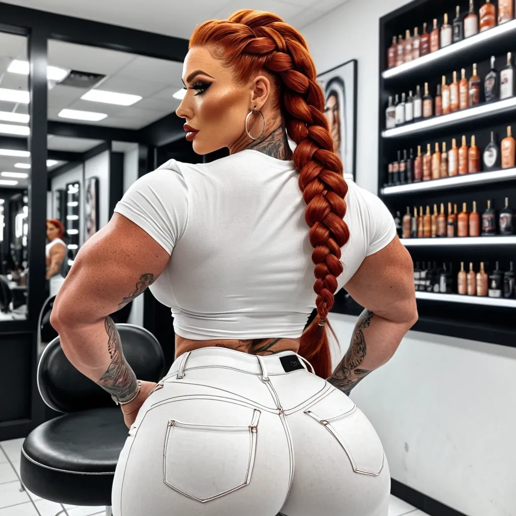 Generate Gorgeous female boss , bimbo , hourglass body , abnormally massive female bodybuilder , gorgeous , close up , full lips , big booty , redhead , freckles on face and breast , braided design hair , feminine silhouette , too big breast , big booty , sexy thighs abs , silhouette , up close , flexing biceps , beautiful green eyes , legs are iconic and defining physical feature , both visually and in terms of combat ability.wearing an outfit that is a striking blend of elegance , power , and femininity , designed to command attention in any room. The suit is tailored to perfection , hugging the wearer’s curves with precision while emphasizing a structured silhouette. The fabric itself is a refined grey tweed patterned with subtle white grid lines , giving the suit a texture that feels both sophisticated and modern. The blazer features broad blue lapels and gold button accents , adding a luxurious touch that elevates the look beyond typical business attire. The matching high-waisted trousers elongate the frame , further enhancing the poised and commanding effect of the ensemble.The styling choices amplify the boldness of the suit. The inner blouse is a silky , greybutton-down shirt that complements the tweed’s tone while introducing a softer , feminine balance to the sharp tailoring of the jacket. The blouse peeks out neatly from under the blazer , maintaining elegance without drawing focus away from the suit’s commanding cut. Accessories are kept minimal yet intentional: a delicate layered gold necklace and hoop earrings that add glimmers of light and luxury without overpowering the outfit. The choice of voluminous , honey-brown braids cascading down her shoulders frames the face with both confidence and glamour , completing the commanding visual.Altogether , this look communicates a blend of authority and allure. It is business-ready yet fashion-forward , balancing corporate structure with vibrant femininity. The color palette blue , grey and gold avoids being overly delicate , instead embracing the richness of texture , structure , and presence. This is the kind of ensemble that speaks to ambition , sophistication , and personal style—ideal for someone who thrives in positions of influence but insists on expressing her individuality with bold elegance. It’s not just clothing—it’s a statement of power wrapped in grace. In luxury living legs that could crush a watermelon , skirt high boots are a bold and striking statement piece , crafted in glossy black patent leather that gives them a sleek , polished finish. Rising to just below the knee , the boots feature three adjustable buckle straps along the shaft , adding both edge and detail to their design. The towering stiletto heel , paired with a thick platform sole , creates an ultra-dramatic silhouette that elongates the leg and exudes power and confidence. With their combination of shine , height , and structure , these boots perfectly balance fierce femininity with high-fashion allure. White t-shirt and jeans shorts in barbershop , profile shot , her back facing camera look back at viewer , enormous butt ,