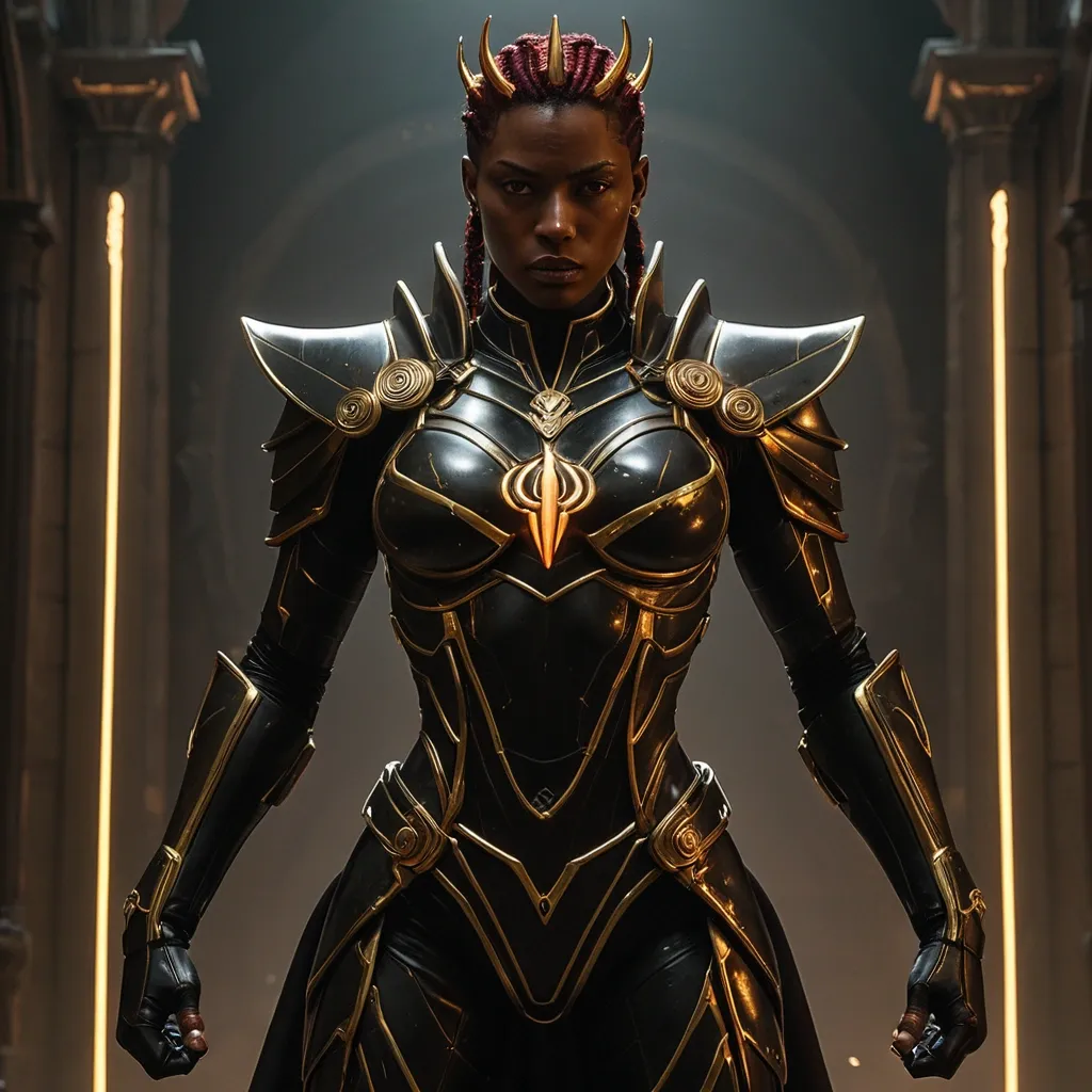 1. At the far left stands Oath Keeper , her Amazonian silhouette filling the frame with disciplined strength. Her maroon-and-pearl-white armor gleams under the noir lighting , gold accents catching the faint neon drifting behind her. Her braided red hair spills over her shoulder like a burning banner , each strand outlined with 8K clarity. Her full lips are set in a calm , resolute line , her freckles softly illuminated across her high cheekbones. The golden eagle emblem at her chest glows faintly — not bright , but proud — the symbol of an oath she refuses to break. 2. Her armor appears modest yet formidable: maroon plating shaped for mobility , pearl-white core panels , and gold structural lines giving her the look of a warrior-judge. Her muscular chest and powerful shoulders are evident beneath the suit , but the design remains respectful and elegant. Her big green eyes forward-lock with unwavering focus; she looks like she sees futures , consequences , promises , and the weight of every life depending on her. 3. Next is Lady Onyx , the embodiment of raw strength fused with cybernetic poise. Her pointy dark-skinned face , chiseled structure , and glowing pearl-white eyes strike immediately. Her black-and-orange braided mohawk arcs back like a sculpted crown , the shaved sides of her head lined with glowing circuitry. Her black armored bodysuit with orange conduits hugs her enormously muscular yet feminine frame , hard-leather tank top exposing the “LO” emblem across her chest — a mark of dominance and legacy. 4. Her expression is intense and unblinking , eyes glowing like molten stars. Her posture is slightly forward , shoulders set as if she’s ready to charge through steel. The faint shimmer on her dark skin , combined with her hard exoskeleton mask wrapping around her jawline , gives her a war-machine goddess presence. Even in a heroic pose , Lady Onyx carries the aura of someone who breaks through things rather than walks around them. 5. At the center stands Shadow Vow , the anchor of the formation. Waist-up , his massive , bodybuilder-sized frame dominates the middle like a steel pillar wrapped in leather. His black , burgundy , and gold-accented bodysuit clings to every muscle , each contour sculpted by noir lighting. His hood shadows his forehead , but his eyes and goateed mouth remain visible — a mix of hard resolve and a restrained fire. The golden scales of justice emblem on his chest reflects a solemn oath older than fear itself. 6. Shadow Vow’s presence is magnetic: brown skin illuminated by streaks of golden and red neon , veins and muscle striations subtly defined. His posture is upright , shoulders back , fists semi-clenched. Power meets purpose. His cape falls behind him in a wide dramatic sweep , not fluttering , but weighted — symbolic of responsibility more than theatrics. His deep stare carries the promise he lives by: the promise he is when it’s broken. 7. On the far right is Ironside , towering even waist-up , the sheer mass of his canon physique impossible to ignore. His younger , ruggedly handsome face is stern , his curled mustache pristine , and his brown eyes razor-focused. He wears his classic black leather armored trench coat paired with the layered vest and heavy plating beneath it — all matte , all tactical , all intimidating. The glossy shadowing across his chest armor catches just enough light to show the depth of its construction. 8. His neck and traps look like they’re carved from granite , and even from the waist up , his 6’5” stature radiates dominance. His coat’s glowing accents add a futuristic edge to the otherwise 1940s-inspired silhouette , and the subtle metallic seams of his vest speak to Virellum-level craftsmanship. He is the immovable object beside Shadow Vow’s unstoppable force — a duo that could level a building side by side. 9. Together , the four form an unbreakable line. Oath Keeper’s resolute grace , Lady Onyx’s volcanic strength , Shadow Vow’s righteous fury , and Ironside’s immovable power blend into a perfect tableau. The lighting frames them like legends carved in smoke and neon: gold from the left , teal from" the right , and a strong key-light directly above to shape their faces and armor into cinematic clarity. The pose is heroic but grounded , intimidating but noble. 10. At the bottom of the visual , in bold metallic serif lettering — sharp , elegant , powerful — reads: THE SHADOWS — LOGO PARAGRAPH Against a black-and-gold backdrop , the team’s emblem rises like a whispered warning carved into the night. At the center stands the silhouette of a tall hooded figure — the Shadow himself — outlined in molten gold , his form sharp but mysterious , as if sculpted from darkness. The black interior of the hood is pure void , swallowing light , while the gold tracing around the cloak flickers like embers waiting to ignite. Behind him , subtle gold streaks radiate outward , creating the impression of movement , legacy , and danger converging into one symbol. It feels ancient yet futuristic , regal yet ruthless , a mark that tells Dream City exactly who walks its rooftops when justice becomes personal. At the base of the design , bold metallic lettering glows with weight and authority: THE SHADOWS ,