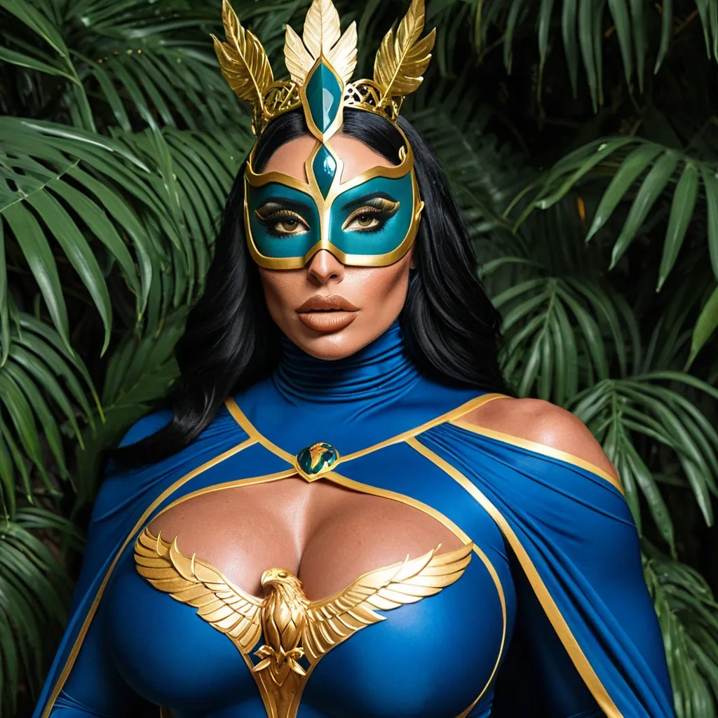 Generate Gorgeous female boss , latina , protruding snout , bimbo , hourglass body , abnormally massive female bodybuilder , gorgeous , close up , full lips , big booty , black hair , black stylish hair , feminine silhouette , too big breast , big booty , sexy thighs abs , silhouette , up close , flexing biceps , beautiful green eyes , legs are iconic and defining physical feature , both visually and in terms of combat ability.wearing an outfit that is a striking blend of elegance , power , and femininity , designed to command attention in any room. The suit is tailored to perfection , hugging the wearer’s curves with precision while emphasizing a structured silhouette. The fabric itself is a refined grey tweed patterned with subtle white grid lines , giving the suit a texture that feels both sophisticated and modern. The blazer features broad blue lapels and gold button accents , adding a luxurious touch that elevates the look beyond typical business attire. The matching high-waisted trousers elongate the frame , further enhancing the poised and commanding effect of the ensemble.The styling choices amplify the boldness of the suit. The inner blouse is a silky , greybutton-down shirt that complements the tweed’s tone while introducing a softer , feminine balance to the sharp tailoring of the jacket. The blouse peeks out neatly from under the blazer , maintaining elegance without drawing focus away from the suit’s commanding cut. Accessories are kept minimal yet intentional: a delicate layered gold necklace and hoop earrings that add glimmers of light and luxury without overpowering the outfit. The choice of voluminous , honey-brown braids cascading down her shoulders frames the face with both confidence and glamour , completing the commanding visual.Altogether , this look communicates a blend of authority and allure. It is business-ready yet fashion-forward , balancing corporate structure with vibrant femininity. The color palette blue , grey and gold avoids being overly delicate , instead embracing the richness of texture , structure , and presence. This is the kind of ensemble that speaks to ambition , sophistication , and personal style—ideal for someone who thrives in positions of influence but insists on expressing her individuality with bold elegance. It’s not just clothing—it’s a statement of power wrapped in grace. In luxury living legs that could crush a watermelon , skirt high boots are a bold and striking statement piece , crafted in glossy black patent leather that gives them a sleek , polished finish. Rising to just below the knee , the boots feature three adjustable buckle straps along the shaft , adding both edge and detail to their design. The towering stiletto heel , paired with a thick platform sole , creates an ultra-dramatic silhouette that elongates the leg and exudes power and confidence. With their combination of shine , height , and structure , these boots perfectly balance fierce femininity with high-fashion allure. High cheekbones , prominent jawline , gorgeous big green eyes , freckles , enormous breast , wearing a crown/mask the leaves her beautiful eyes and mouth exposed , a blue and gold accented modest turtleneck bodysuit with a gold eagle on the chest and a blue cape , giver her a mask that cover her top half of face ,