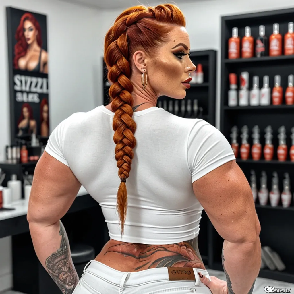 Generate Gorgeous female boss , bimbo , hourglass body , abnormally massive female bodybuilder , gorgeous , close up , full lips , big booty , redhead , freckles on face and breast , braided design hair , feminine silhouette , too big breast , big booty , sexy thighs abs , silhouette , up close , flexing biceps , beautiful green eyes , legs are iconic and defining physical feature , both visually and in terms of combat ability.wearing an outfit that is a striking blend of elegance , power , and femininity , designed to command attention in any room. The suit is tailored to perfection , hugging the wearer’s curves with precision while emphasizing a structured silhouette. The fabric itself is a refined grey tweed patterned with subtle white grid lines , giving the suit a texture that feels both sophisticated and modern. The blazer features broad blue lapels and gold button accents , adding a luxurious touch that elevates the look beyond typical business attire. The matching high-waisted trousers elongate the frame , further enhancing the poised and commanding effect of the ensemble.The styling choices amplify the boldness of the suit. The inner blouse is a silky , greybutton-down shirt that complements the tweed’s tone while introducing a softer , feminine balance to the sharp tailoring of the jacket. The blouse peeks out neatly from under the blazer , maintaining elegance without drawing focus away from the suit’s commanding cut. Accessories are kept minimal yet intentional: a delicate layered gold necklace and hoop earrings that add glimmers of light and luxury without overpowering the outfit. The choice of voluminous , honey-brown braids cascading down her shoulders frames the face with both confidence and glamour , completing the commanding visual.Altogether , this look communicates a blend of authority and allure. It is business-ready yet fashion-forward , balancing corporate structure with vibrant femininity. The color palette blue , grey and gold avoids being overly delicate , instead embracing the richness of texture , structure , and presence. This is the kind of ensemble that speaks to ambition , sophistication , and personal style—ideal for someone who thrives in positions of influence but insists on expressing her individuality with bold elegance. It’s not just clothing—it’s a statement of power wrapped in grace. In luxury living legs that could crush a watermelon , skirt high boots are a bold and striking statement piece , crafted in glossy black patent leather that gives them a sleek , polished finish. Rising to just below the knee , the boots feature three adjustable buckle straps along the shaft , adding both edge and detail to their design. The towering stiletto heel , paired with a thick platform sole , creates an ultra-dramatic silhouette that elongates the leg and exudes power and confidence. With their combination of shine , height , and structure , these boots perfectly balance fierce femininity with high-fashion allure. White t-shirt and jeans shorts in barbershop , profile shot , her back facing camera look back at viewer ,