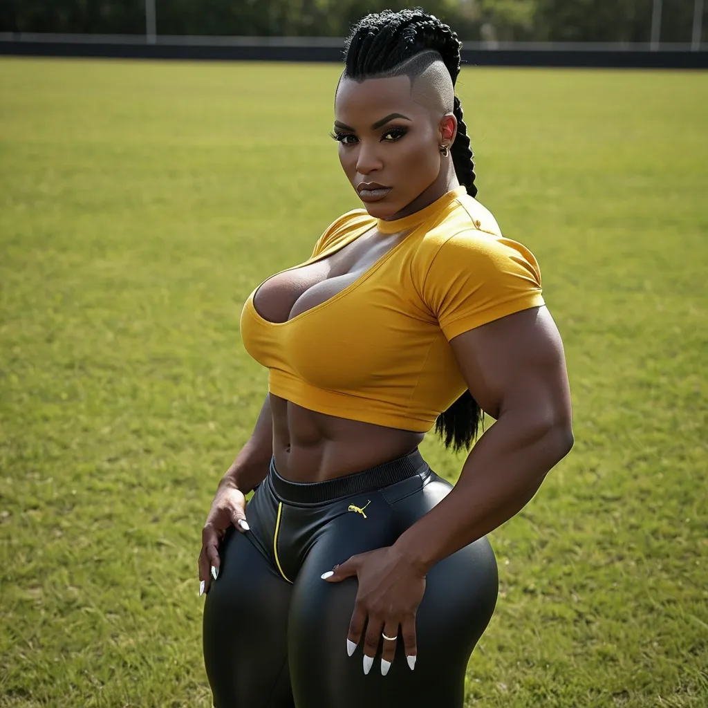 Generate a dark-skinned African-American woman , gorgeous female boss , bimbo , hourglass body , female bodybuilder , gorgeous , close up , full lips , big booty , black hair , braided-style-mohawk that she wears bald on the side , feminine silhouette , too big breast , big booty , sexy thighs abs , silhouette , up close , flexing biceps , beautiful light hazel eyes , legs are iconic and defining physical feature , both visually and in terms of combat ability.wearing an outfit that is a striking blend of elegance , power , and femininity , designed to command attention in any room. outfit in this image is a modern , giving it both structure and a touch of relaxed style. highlighting her curves while keeping the look balanced and versatile. Its neutral tone contrasts nicely against the blue denim , keeping the ensemble cohesive without overpowering the statement of the.Completing the polished and fashionable. Together , the outfit blends everyday comfort with bold , confident styling. This is the kind of ensemble that speaks to ambition , sophistication , and personal style—ideal for someone who thrives in positions of influence but insists on expressing her individuality with bold elegance. It’s not just clothing—it’s a statement of power wrapped in grace , Massive cleavage thunder thighs , enormous butt , muscular legs , hazel eyes , up close shot. Black and yellow t-shirt and black pants outside in recreational field , closed top collar , pants ,