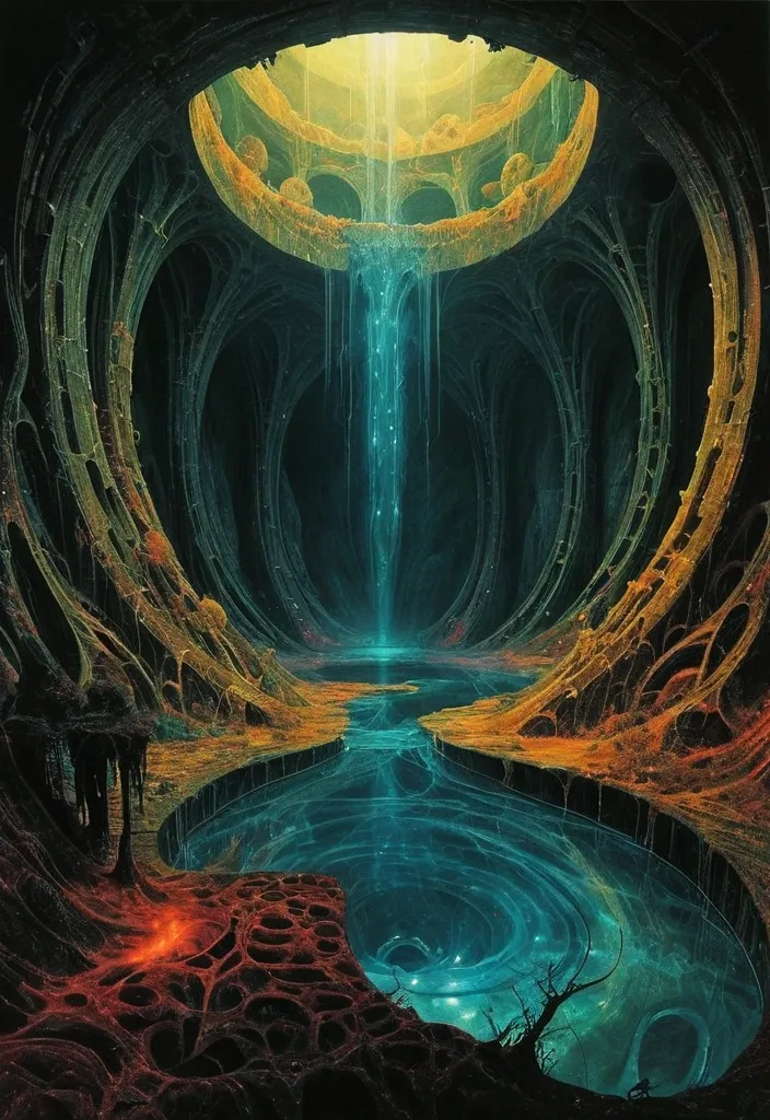 Panopticon Vortex Octavio: A surrealist fantasy featuring a colossal open-cave with a diminutive river , surrounded by flowing color pools that cascade through negligible vegetation , rendered in the distinctive , mysterious Style of Zdzisław Beksiński and H.R. Giger , cinematic lighting , dramatic atmosphere. ,