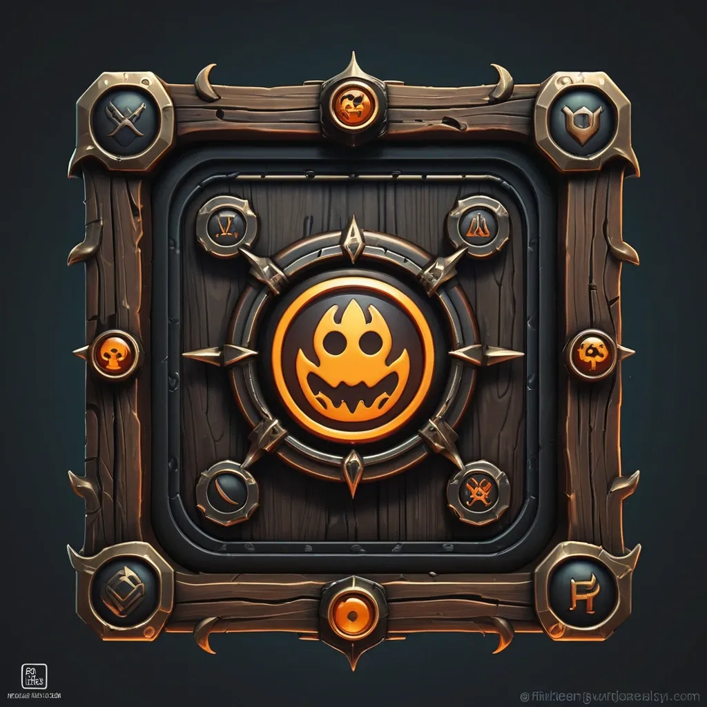 blurry , low quality , ugly , deformed , bad anatomy , extra fingers , photorealistic , hyperrealistic , anime , cartoon , modern objects , text , watermark , logo , oversaturated. Navigation button frame. Medieval button frame , dark wood and dark metal border , fantasy game UI , empty center for icon and text , beveled edges , horizontal shape , stylized , format 512×256. stylized realism , digital painting , high-fantasy mobile game art , dark palette with warm orange and gold accents , no text , no watermark , premium 2D illustration ,