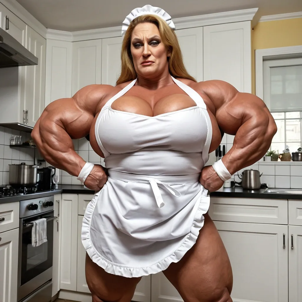 Amazon giant Maid woman BBW musclée , heavy weight bodybuildeuse géante et plantureuse with giant chest , imposante dame massive , Meryl Streep face , avec de gros seins , énormes biceps musclés , in white mini apron tablier sexy , exposant les seins , bras musclés exposés , dominante , jambes massives exposées , agressive , ,