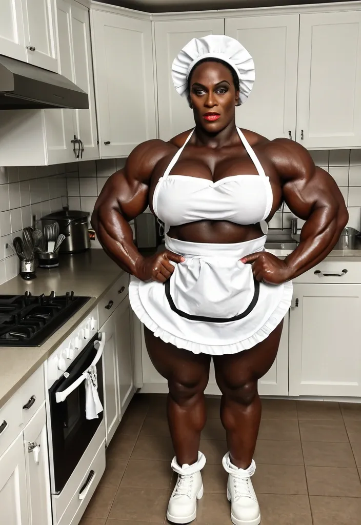 African Maid woman BBW musclée , heavy weight bodybuildeuse géante et massive with giant chest , imposante dame noire , Meryl Streep face , avec de gros seins , énormes biceps musclés , in white mini apron tablier sexy , exposant les seins , bras musclés exposés , dominante , jambes massives exposées , agressive , ,