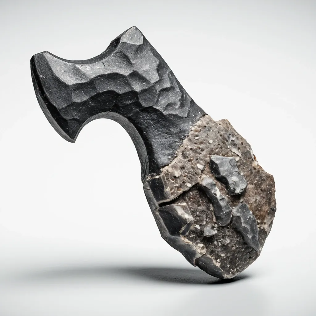 Flint Tool of Homo Heidelbergensis , chipped stone hand axe with sharp edges and rough flaked surfaces , Style: hyperrealistic with a painterly texture , reminiscent of historical reconstruction art , detailed and atmospheric with subtle depth of field , White or Transparent Background , Full view , Side View , 4K. ,