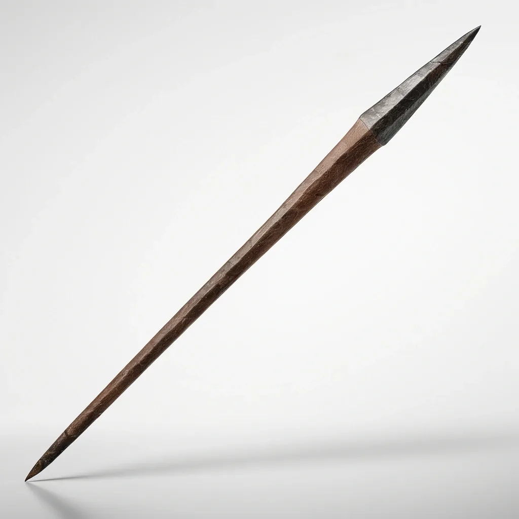 Schöningen Spear , finely crafted wooden hunting spear from the Lower Paleolithic era with a sharpened point and smooth polished surface , Style: hyperrealistic with a painterly texture , reminiscent of historical reconstruction art , detailed and atmospheric with subtle depth of field , White or Transparent Background , Full view , Side View , 4K. ,