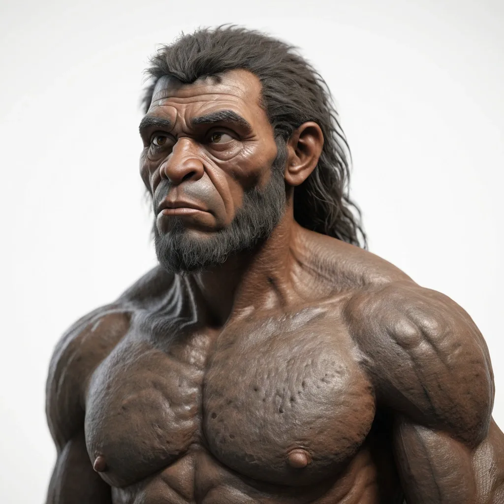 Homo heidelbergensis , early human ancestor with robust build , broad chest , heavy brow ridge , and primitive facial features , Style: hyperrealistic with a painterly texture , reminiscent of historical reconstruction art , detailed and atmospheric with subtle depth of field , White Background or Transparent , Full body shot , Side View , 4K. ,