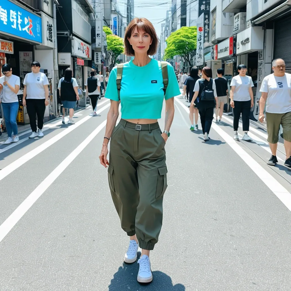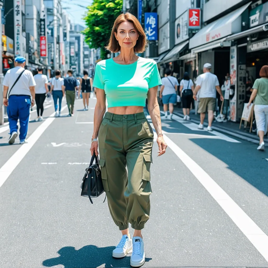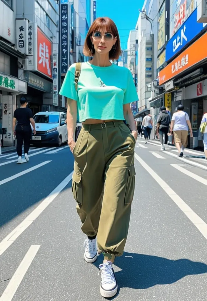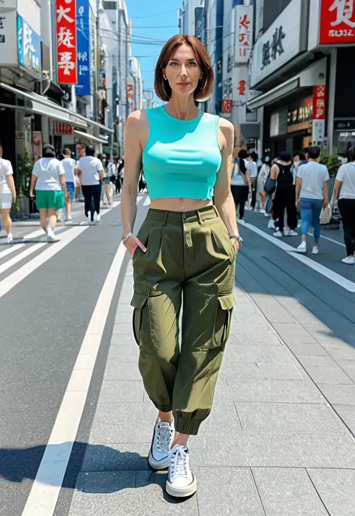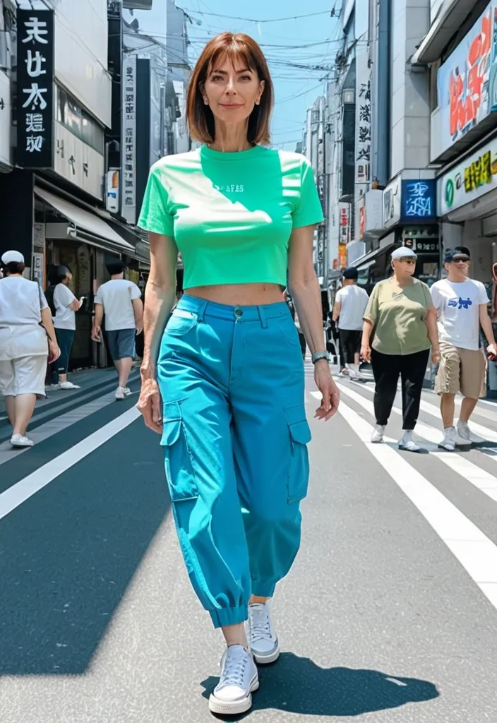 Masterpiece manga style full-length a beautiful european pale teenage girl short straight brown hair green eyes , wearing a Y2K style croptop and matching military cargo trouser , sneakers style converse all clothes are in different shades of neon-blue , she's walking hapily in a modern sunny street like shibuya ,